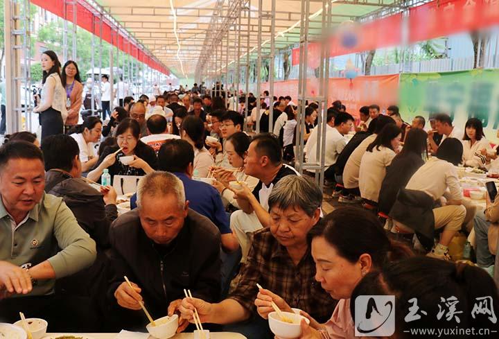 活動(dòng)期間,長(zhǎng)街宴現(xiàn)場(chǎng)百余張餐桌沿街道整齊排布,工作人員忙碌的身影穿梭其間,一場(chǎng)美食盛宴緩緩拉開(kāi)帷幕。裹滿醬香的燒皮子、色澤金黃的蒸蛋卷、酸辣開(kāi)胃的涼米線……一道道華寧“八大碗”特色菜陸續(xù)上桌。此外,還有盛滿葷素食材的華寧特色炊鍋、熱氣騰騰的牛肉湯鍋,10余道菜品將餐桌鋪滿,濃郁的香氣在長(zhǎng)街上散開(kāi),引人垂涎。