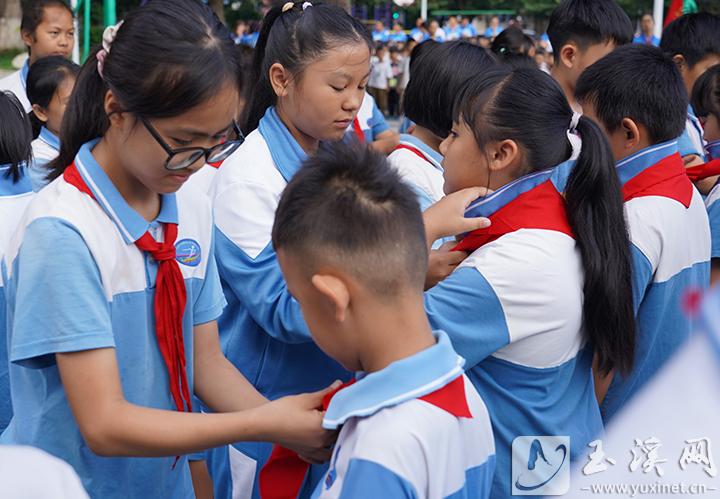 為新隊(duì)員佩戴紅領(lǐng)巾。