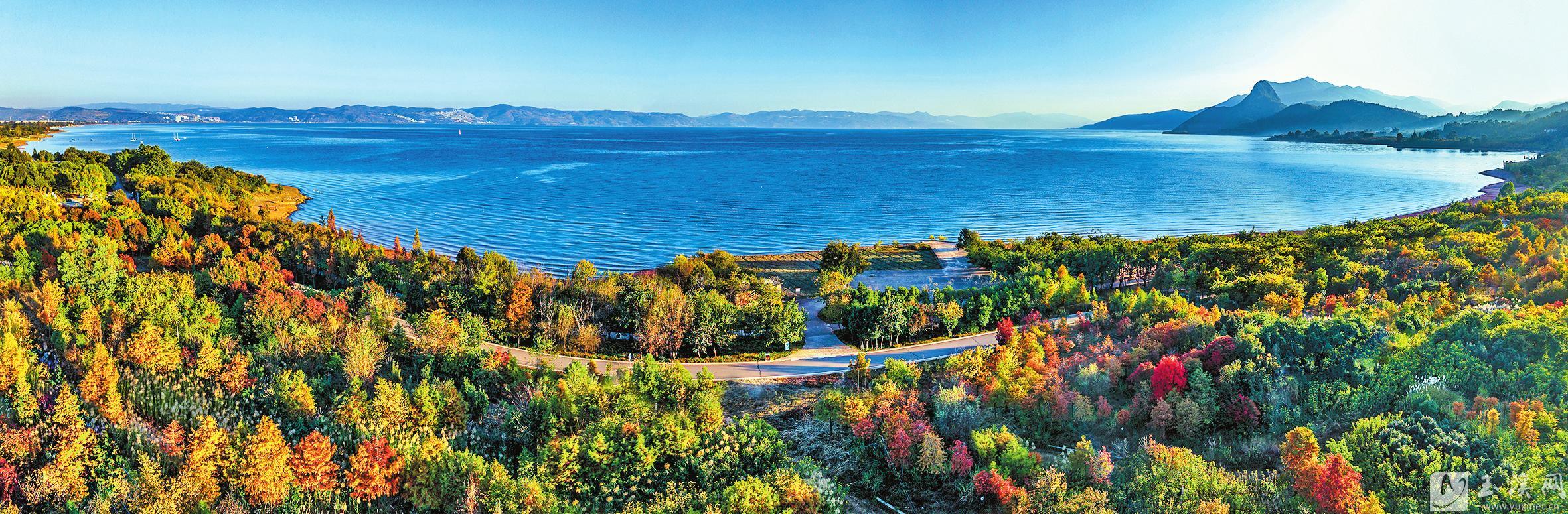 冬日晴空下的撫仙湖,琉璃萬頃,美不勝收。湖畔樹木五彩斑斕,如詩似畫。(玉溪市融媒體中心記者 李江 攝)