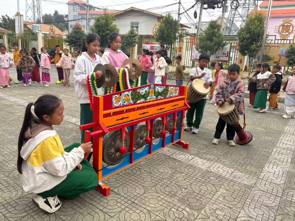當(dāng)象腳鼓的樂聲在操場響起,一場獨具民族特色的大課間開始了。由排芒、象腳鼓和镲組成的演奏聲中,孩子們歡快地跳起傳統(tǒng)舞蹈。SeinPhyo和Yi也情不自禁加入其中,與孩子們一同起舞。