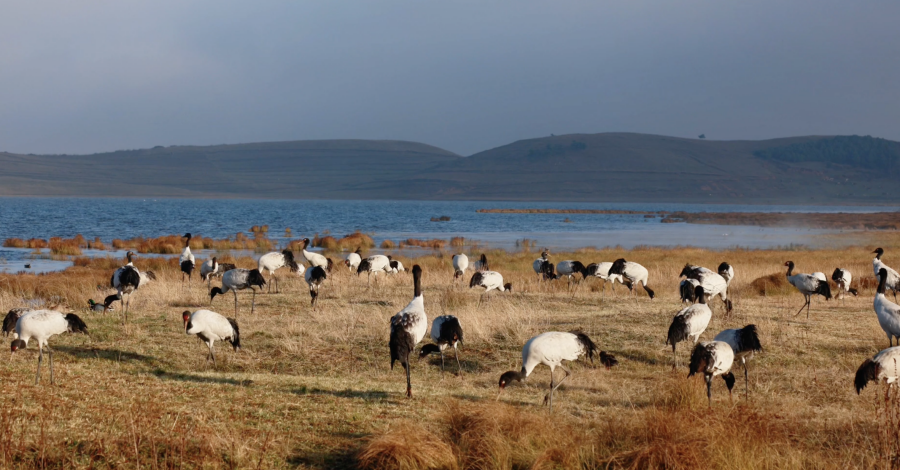 近日,攝影師在云南大山包黑頸鶴國家級(jí)自然保護(hù)區(qū)內(nèi),記錄到黑頸鶴在濕地附近活動(dòng)的場(chǎng)景。在群山環(huán)抱間,黑頸鶴漫步在澄澈的湖水邊,或自在飛翔,或悠閑踱步,或四處覓食,呈現(xiàn)出一派生機(jī)勃勃之景。